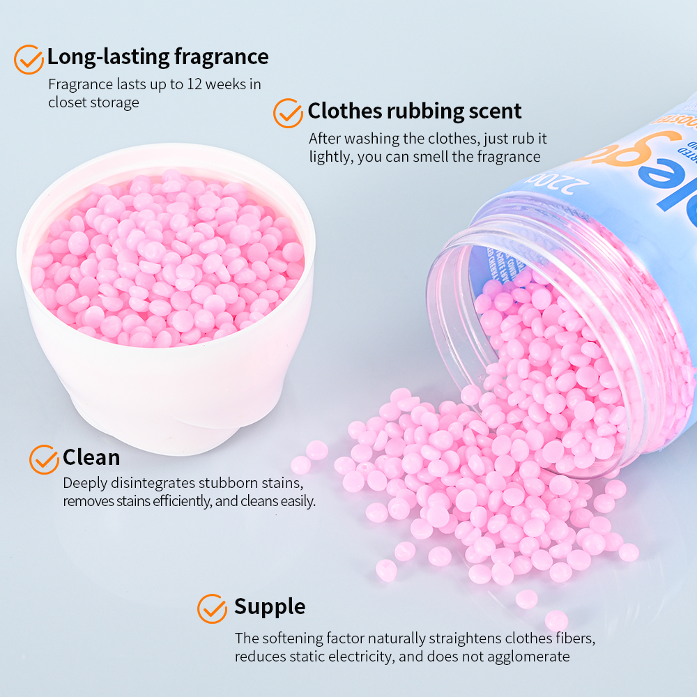 Parameter information: Brand: E-JOY/OEM Shape: Granular Specifications: 200g/220g/OEM Fragrance Types: Lavender/Ocean/Cherry Blossom/Fricia/OEM Color: Customizable according to requirements Functions: Aromatic/Antibacterial/Anti-mite/OEM Ingredients: Factory formula/OEM Packaging specifications: Customized according to requirements Usage: Enhances fragrance and softens clothing Country of origin: Guangdong, China |